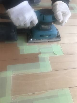 フローリングの床の表面処理(ガサガサに劣化したところを削り取る)といいますか下準備をするそうです。これをやらなければ、結果に大きな差が出るって訳ですね。サンダーを使用して修理するフローリングの塗装を完全に落とします。